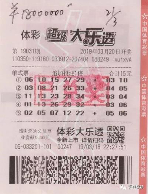 3月20日,在体彩大乐透第19031期开奖中,小江凭借一张5注15元投入的单式追加票,中出1注1800万元一等奖。