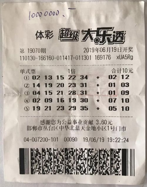 6月19日,在体彩大乐透第19070期开奖中,该男子凭借一张5注10元投入的单式票,中出1注1000万元一等奖。