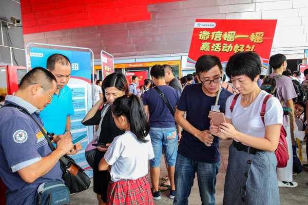 而番禺区亚运城的活动现场,节目也是丰富多彩:现场“微信摇一摇赢好礼”有奖问答,奖品居然是有机会赢取最高100万元奖金的顶呱刮即开票!同时还设置了“拼图”、“投沙包”、“投球”、“夹弹珠”等趣味互动小游戏,吸引了众多市民热情参与。