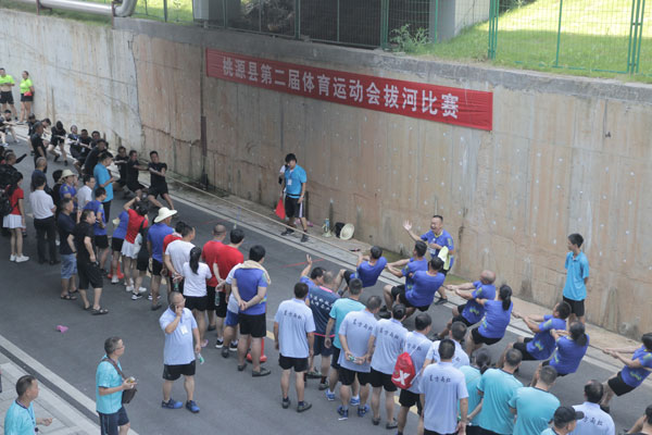 在开幕式后,精彩的拔河比赛在桃源县一中体育馆举行。当天的比赛分为四块场地同时举行,比赛形式为男女混合团体赛,采取三局两胜的赛制,每支队伍每次派出7名男队员、4名女队员上阵。现场气氛非常热烈,每支队伍都选了最为壮实的男队员“压轴”,大家全力以赴,在啦啦队声嘶力竭的呐喊声中呈现出“咬牙切齿”的模样。有的队伍“摧枯拉朽”地以2比0结束战斗,有的则势均力敌战到第三场。