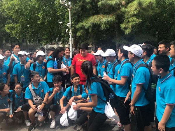 “中国,中国,沸腾的山河,前进浪潮,波澜壮阔……中国,中国,鲜红的太阳永不落。”刚刚走进北京体育大学的校门,嘹亮的歌声吸引了夏令营师生们的注意力,这是国家队在拍摄宣传片。突然队伍里有人喊:“我认识她,她是世界铅球冠军!快帮我拍张照片。”夏令营的师生们纷纷涌上去和世界铅球冠军巩立姣合影。
