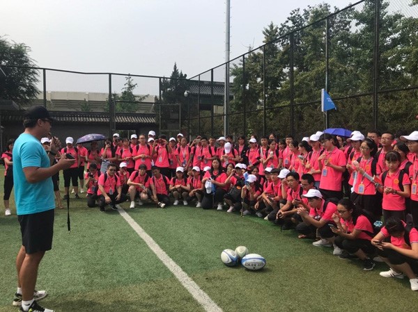 雨后球场,绿茵如毡。橄榄球运动员们不遗余力地奋力撞击、抢攻。而在场边,一群穿着粉红色上衣的青少年们,生疏地抛掷着手中的橄榄球。对他们来说,这项运动还很陌生。