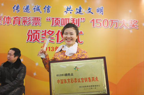 2013年1月22日,四川体彩举行“传递诚信共建文明———即开型体育彩票顶呱刮150万元大奖颁奖仪式”,诚信业主陈小玲获得了“中国体育彩票诚信销售网点”奖牌及奖杯。