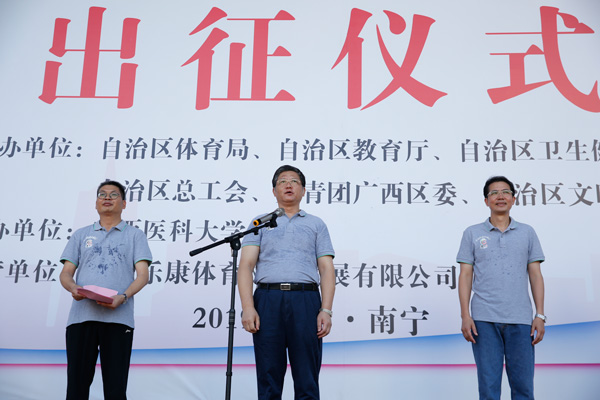 6月21日上午,第四届“万名全民健身志愿者服务百县千乡”活动出征仪式在广西医科大学举行。广西自治区体育局、文明办、卫生健康委、共青团广西区委等相关单位代表,主办单位、承办单位、各高校大学生志愿者和社会志愿者代表等1000多人参加了出征仪式。