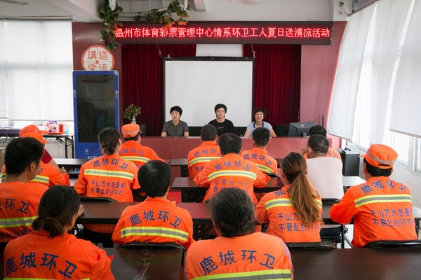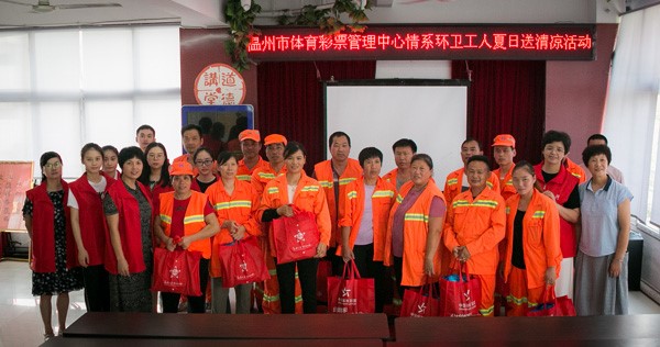 近年来,温州市体彩管理中心每年夏天都会开展为环卫工人“送清凉”活动,此项活动已经连续开展8年。此外,还在体彩网点设立“环卫工人歇脚点”,提供茶水、纳凉等服务,并多年持续开展“我给环卫工人加个菜”等活动。
