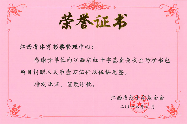 回顾2018年,省体彩中心也积极参与省红十字基金会发起的以“同圆中国梦,守护安全行”为主题的学生安全防护书包捐赠活动。共筹集善款15950元,用于购买55套安全防护书包。