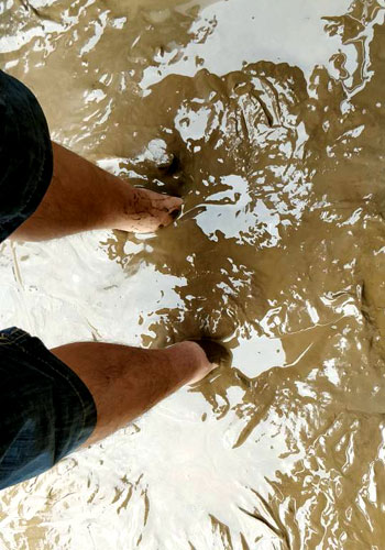 由于内涝造成全市交通瘫痪,出城道路受堵,车辆无法前行,分中心综合管理员刘勇主动请缨,骑着摩托奔赴受灾最严重的湘东区。查看完位于国道边受损较轻的3616016518网点后,摩托也无法前行了,但这都无法阻挡体彩人前行的脚步。刘勇脱下鞋子拎在手上,赤脚踩着没到小腿的淤泥,赶往下一个受灾门店。情况紧急,刘勇也无暇顾忌淤泥中的玻璃屑和疫病风险,一心只想尽早和受灾门店业主汇合,了解他们的受灾情况,鼓舞他们的信心。