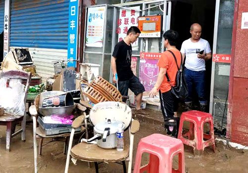 看着到处内涝的城区,分中心主任韩志伟和副主任罗山崎心急如焚,一大早两人就赤着脚跑完了步行能到的门店。另一边,市区专管员杨帆和刘健也正在受灾门店查看和帮忙转移重要设备。杨帆趟着齐腰深的洪水,赶赴店内已成一片汪洋的3616016108门店,救助中一脚踩空,导致手腕扭伤,他忍着疼痛帮身患残疾的业主转移店内物资。所幸转移及时,除终端机外,店内电子走势图等物品未受损失。灾后第二天,该门店就恢复销售。