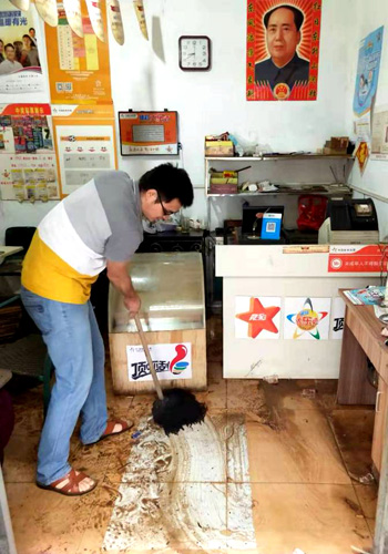 看着微信工作群里大家及时上传的现场照片,得知市区门店由于预警及时受灾情况相对较轻后,韩志伟和罗山崎心里稍感安慰,同时更加深了对湘东重灾区的担忧。两人不顾劳累马上赶往湘东,和刘勇、张波汇合。两人打着赤脚,深一脚浅一脚和同事们一起帮着业主清扫店内遍地的淤泥和玻璃碎片。同时告知他们国家中心、省体育局和省中心都在挂念着受灾情况,大家齐心协力一起开展生产自救,争取早日恢复正常销售。