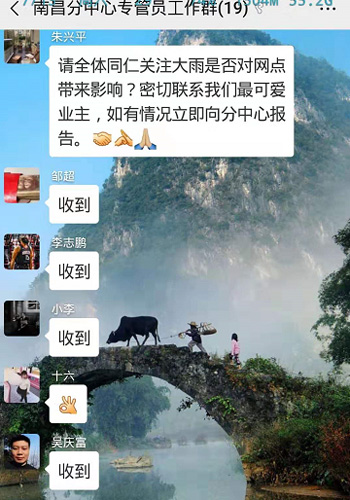 7:00,分中心主任朱兴平在工作群中发出密切关注暴雨可能给体彩门店带来影响的提醒;