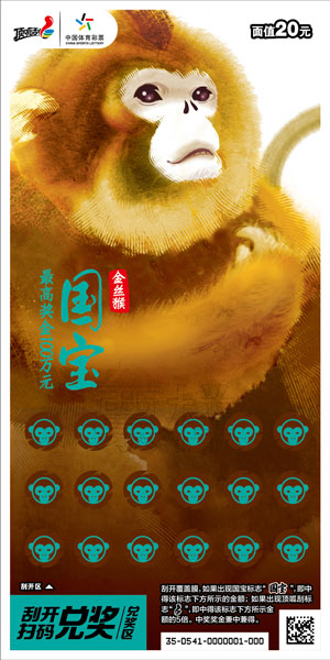 “国宝”是静物动物类主题票,一套3张,以熊猫、金丝猴、藏羚羊为票面形象,票面采用中国古典水墨晕染技法,清雅别致,格调优雅。该票共有18次中奖机会,设9个奖级,头奖100万元。该款彩票以国家珍稀动物为题材,传达公益环保的正能量。