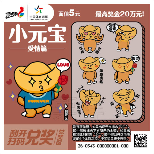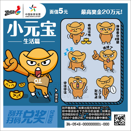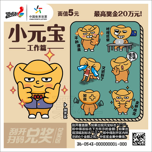 “小元宝”是财富类主题票,一套4张,以专属开发的小元宝表情符号为主形象,俏皮姿态辅以趣味语言,覆盖生活、工作、爱情等场景。该票共有6次中奖机会,头奖20万元。关注“体彩顶呱刮”微信公众号者,可下载“小元宝”专属表情包。