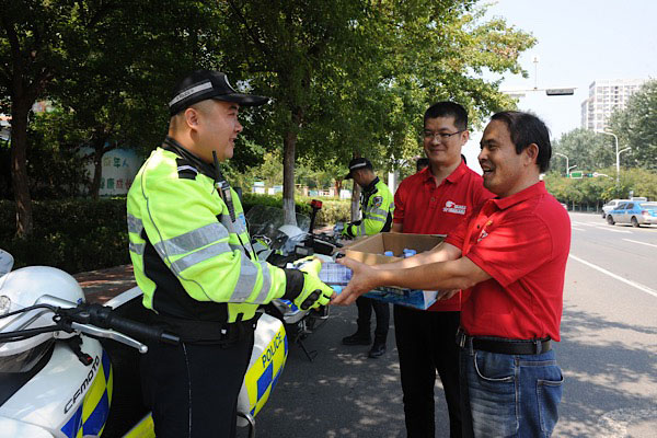 体彩中心的党员和志愿者们又来到北城新区上海路和北京路的交汇路口,慰问在一线执勤的铁骑交警。铁骑大队五中队队员张记礼正在路面巡逻。张记礼接过志愿者们送来的“爱心水”,激动地说:“我们铁骑队员穿的衣服比较厚,天气这么热,出汗非常多,每天需要大量补水。你们送来的水正是我们在高温天气里巡逻所需要的,谢谢你们的爱心了!”