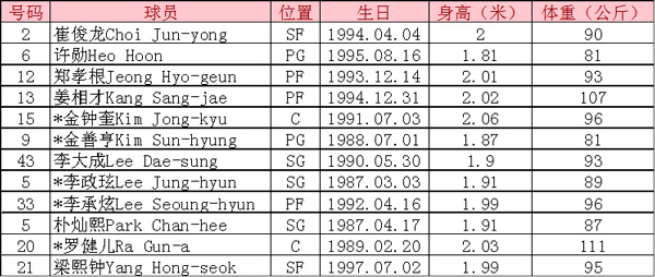 (注:韩国男篮已经公布了12人名单,标*者为预计首发球员。)