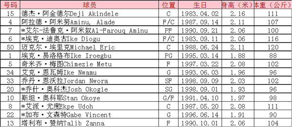 (注:尼日利亚男篮目前名单中有14人,还需裁掉2人,标*者为预计首发球员。)