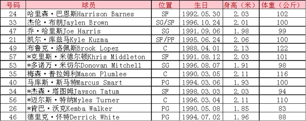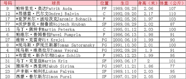 (注:捷克男篮目前名单14人,还需裁掉2人,标*者为预计首发球员。)