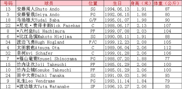 (注:日本男篮目前名单15人,还需裁掉3人,标*者为预计首发球员。)