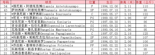 (注:希腊男篮现有名单13人,还需裁掉1人。标*者为预计首发球员。)