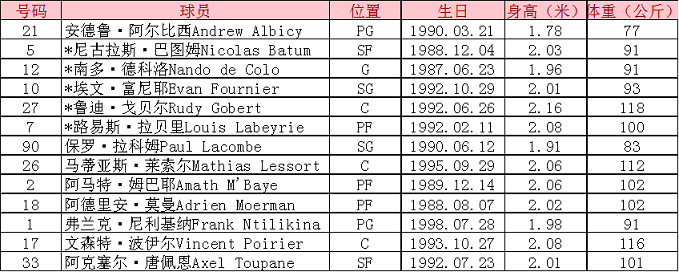 (注:法国男篮目前名单13人,还需裁掉1人,标*者为预计首发球员。)