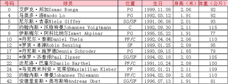 (注:德国男篮目前名单13人,还需裁掉1人,标*者为预计首发球员。)