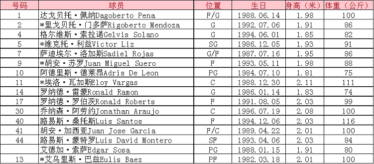 (注:多米尼加男篮目前名单16人,还需裁掉4人,标*者为预计首发球员。)