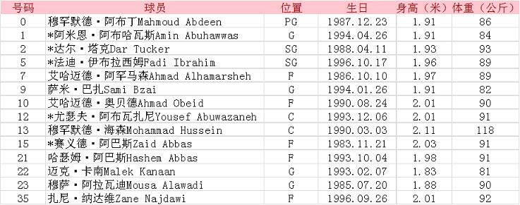 (注:约旦男篮目前名单14人,还需裁掉2人,标*者为预计首发球员。)