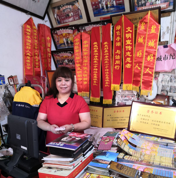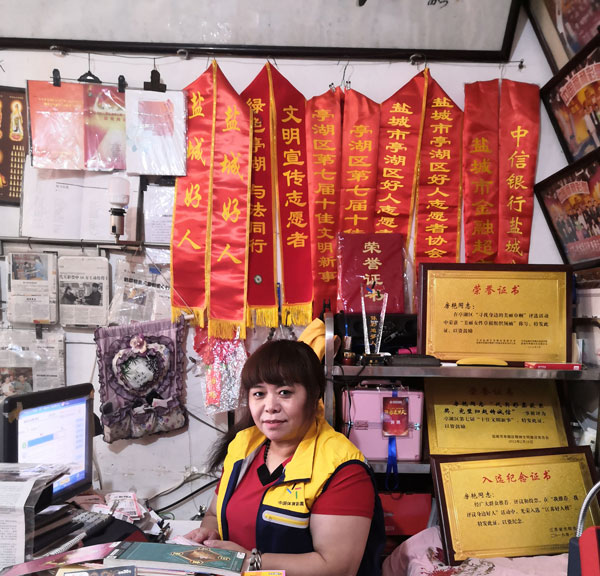 这家体彩店的主人名叫房艳,在这个坐落于江苏省盐城市毓龙路东关西巷的小小店面里,她已度过19年的时光,也经历了很多感人的故事。在这里,她看到过人们惊喜的表情,听到过大家欢快的笑声,也流下过感动的泪水,她一次次向需要帮助的人伸出援手,因此收获的称呼也越来越多—— “亭湖好人”“盐城好人”“爱心妈妈”“好心大姐”“盐城市文明宣传志愿者”……只要说起房艳,大家都会竖起大拇指称赞。