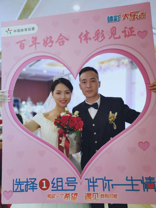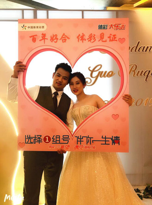 经过前期的新人报名和后台遴选,湖北体彩为在2019年9月和10月于湖北省内地级(县级)城市酒店举行婚宴的新人送上100场“特别的祝福”。祝福的内容诚意满满:送新人象征爱情甜蜜的600元顶呱刮即开票一本;颁发“百年好合体彩见证”公益证书;免费赠送每位来宾一张有3次冲击1800万元大奖的大乐透彩票,彩票号码还可以参考新人的生日、结婚日期等具有纪念意义的数字特别定制……