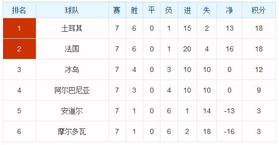 法国和土耳其目前在H组中同积18分,土耳其因相互战绩的优势排名榜首,法国屈居次席。为确保出线,两队都将全力出击。法国今年6月在土耳其的魔鬼主场窝囊的0比2告负,本轮坐镇主场唯有撂倒对手方可一解心头之恨。无论是整体实力还是过往交战记录,法国均优势明显。