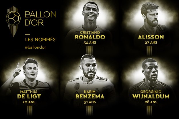 C罗(尤文图斯/葡萄牙),阿利松(利物浦/巴西),德里赫特(尤文图斯/荷兰),本泽马(皇家马德里/法国),维纳尔杜姆(利物浦/荷兰)