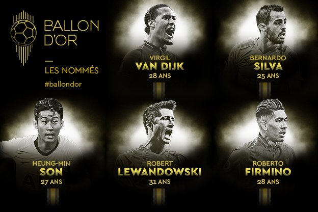 范戴克(利物浦/荷兰),贝尔纳多-席尔瓦(曼城/葡萄牙),孙兴慜(托特纳姆热刺/韩国),莱万多夫斯基(拜仁慕尼黑/波兰),菲尔米诺(利物浦/巴西)