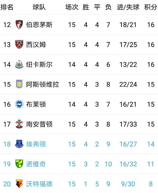 英超第15轮,在默西塞德郡德比中,埃弗顿客场2-5负于利物浦,埃弗顿前15轮英超只取得了4胜2平9负的成绩,排名英超积分榜倒数第三。