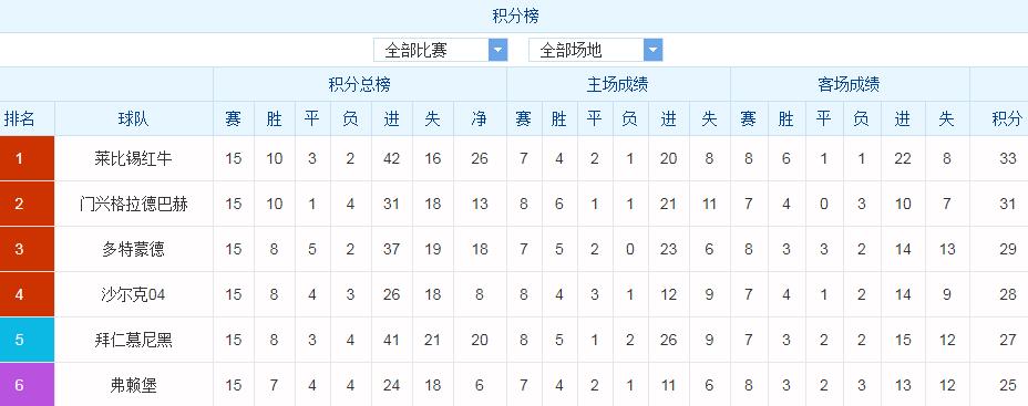 由于德甲霸主拜仁在本赛季遭遇持续的低谷,使得本赛季德甲陷入到群雄逐鹿的局面,榜首的宝座目前是由33分的莱比锡红牛占据,身后是上轮刚刚输球的门兴,接着是传统豪门多特蒙德,上赛季苦于保级的沙尔克本赛季触底反弹,暂列第四,已经德甲七连冠的拜仁在15轮过后只拿到27分,无奈排在第五。