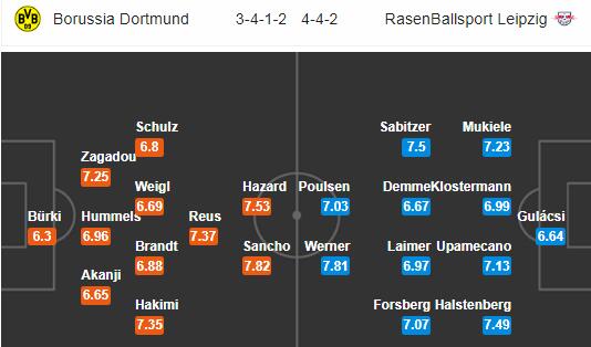 多特蒙德(3-4-1-2):布尔基/扎加杜、胡梅尔斯、阿坎吉/舒尔茨、魏格尔、布兰特、阿什拉夫/罗伊斯/索尔根-阿扎尔、桑乔